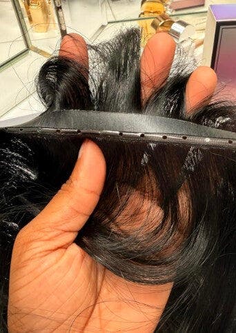 A: A hybrid flat weft combining hand-tied lightness and machine weft strength. Designed to sit flat for an invisible seam and natural scalp appearance.